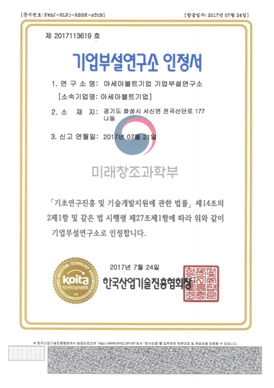 기업부설연구소 인정서 페이지 정보 작성자 아세아볼트 작성일18-01-04 00:19 조회1,592회 댓글0건 관련링크 이전글 다음글 목록 본문 기업부설연구소 인정서 이전글 다음글 목록