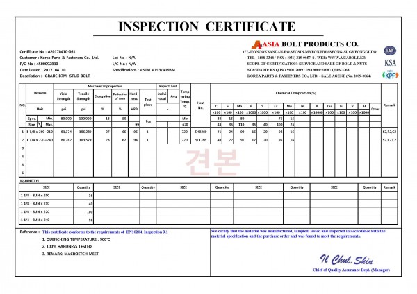 아세아볼트기업 모든 제품은 성적서 발행 가능합니다.